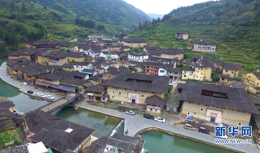 溪流两岸分布着形态各异的土楼。肖和勇 摄