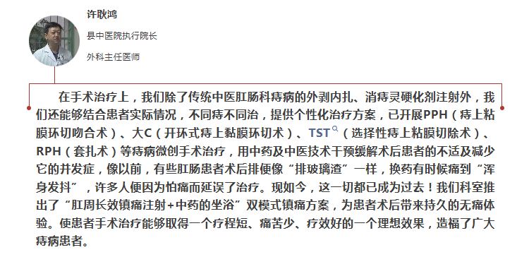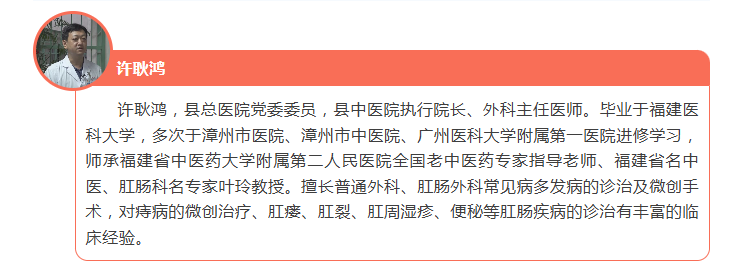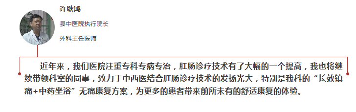 多年来,许耿鸿一直致力于研究将传统中医与现代医学相结合,通过不断的探索和创新,在我县充分应用中药口服、中药坐浴熏洗、中药保留灌肠等传统中医治疗方法治疗肛肠疾病。