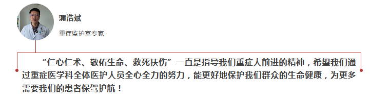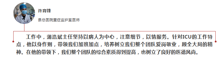 在蒲浩斌的带领下,县总医院ICU成功治疗了各种急性重度中毒合并器官功能衰竭患者、急性心肌梗死溶栓后合并呼吸衰竭、脓毒性休克合并多器官功能衰竭、心肺复苏后患者的生命支持与救治、急性胰腺炎合并多器官功能衰竭及各种术中不稳定、大型术后生命体征监测等多种病例患者。同时,他指导培训年轻医生业务技能与实操,培养提高急诊团队诊疗救治能力,参与建设并通过了县级版的“胸痛中心、卒中中心、创伤中心”,打通胸痛卒中患者的生命快车线,成功救治复苏多名频危患者,发挥多学科联合救治危重症患者,多次获得院部表彰和患者送的锦旗。
