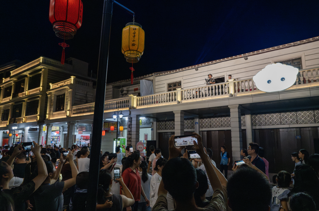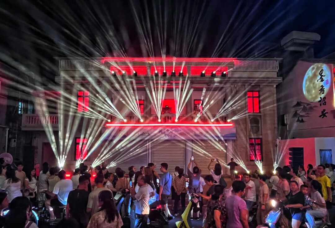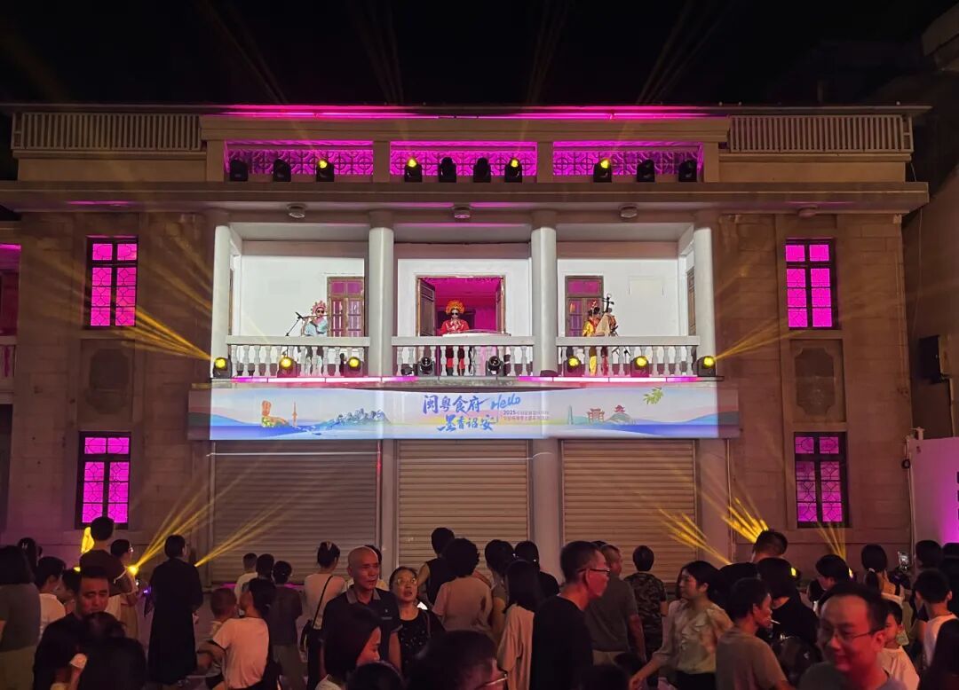 东城社区水车街入口斜对面的二层骑楼,上演了“骑楼幻境”主题光影秀与“骑楼戏梦”文化演出。百年骑楼化身天然幕布,在流光溢彩中融入国潮古乐与经典潮剧选段,实现历史建筑与传统文化的美妙交融。活动还串联了和美天台音乐会、“厝边音乐会”、“嗨翻诏安”脱口秀专场及“邂逅老街”街头艺人表演,以文艺为纽带,聚拢人气,推动传统建筑与诏安艺术在当代潮流中焕发新生。