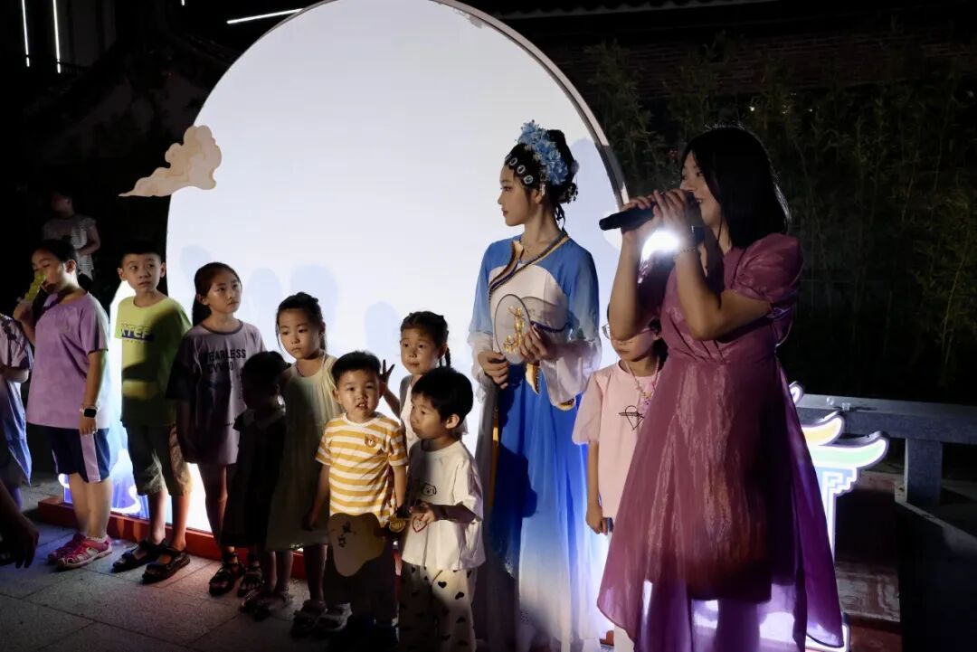 同期,“翰墨飘香 博饼南诏”活动也热闹开启,传统博饼瓷碗与奖品依次摆放,身着状元袍的工作人员引导群众参与“福文化知识问答”,博饼赢取诏安特色文创产品,吸引了许多小朋友的驻足观看。一旁的“嫦娥舞月”舞影互动体验区,3米直径的巨型月亮投影装置格外吸睛。舞蹈演员化身“嫦娥”翩跹起舞,与月影交相辉映,吸引众人纷纷驻足观看,拍照打卡。工作人员手持团扇、纸伞,指导群众拍摄 “奔月”“月下对弈” 等创意合影,定格中秋美好瞬间。