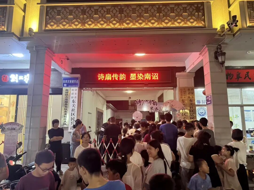 此外,东关社区党群服务中心前的“诗扇传韵 墨染南诏” 文化体验活动同样人声鼎沸。在“诗扇传韵”活动中,参与者通过古诗词接龙、飞花令等游戏可获得制作漆扇资格,可亲自动手将印有“南诏”、“牌坊街”以及“中山路”等 字样的漆扇进行上漆,活动区域采用典雅宋式风格布置,营造沉浸式文化体验。