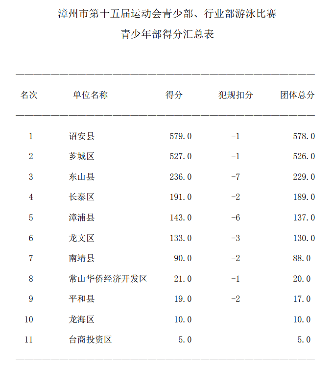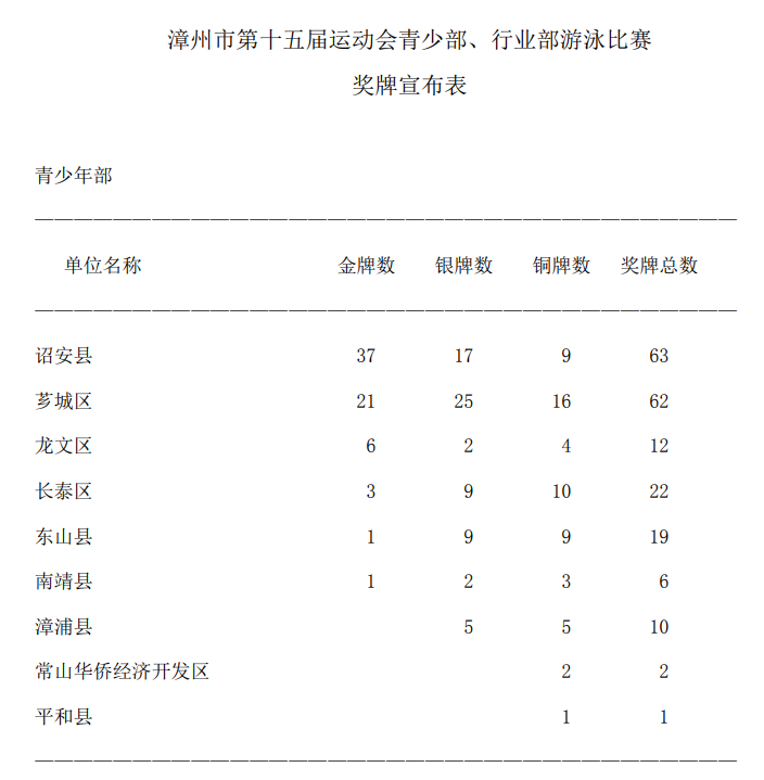 此次赛事中,诏安队尽显实力,一举斩获37枚金牌,以578分的团体总分稳居前列,成功打破7项市纪录。根据官方公布的奖牌宣布表与得分汇总表,诏安队拿下青少部游泳比赛金牌榜第一,登顶总分榜第一,实现 “双冠” 荣耀。