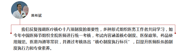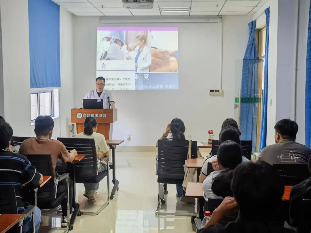 不仅在临床一线冲锋,黄希斌还肩负着医学传承的重任。诏安县总医院以“医教协同、教学相长”为发展战略,搭建技能培训中心、自主学习平台等教学载体。作为资深带教老师,黄希斌已连续5年承担新入职医师岗前培训和轮转医师技能培训,衔接规范化培训体系,为医院培养优秀人才。今年中国医师节,医院还组织全院医师考核核心制度、医保政策等内容,评选“核心制度执行标兵”,黄希斌也全程参与统筹,助力提升医师队伍素养。
