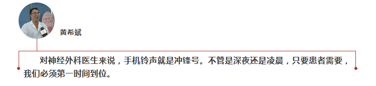 2025年端午节,当万家团圆时,黄希斌却在手术室里彻夜未眠—— 一台紧急开颅手术,他全程坚守,最终成功挽救患者生命。在他眼中,“守护患者健康,就是最好的过节方式”。而面对病情复杂、易焦虑的患者,他总能耐心沟通:曾有患者因觉得治疗无效闹着出院,他拿着病历本,用一个多小时逐页讲解影像变化,最终让患者主动配合康复。