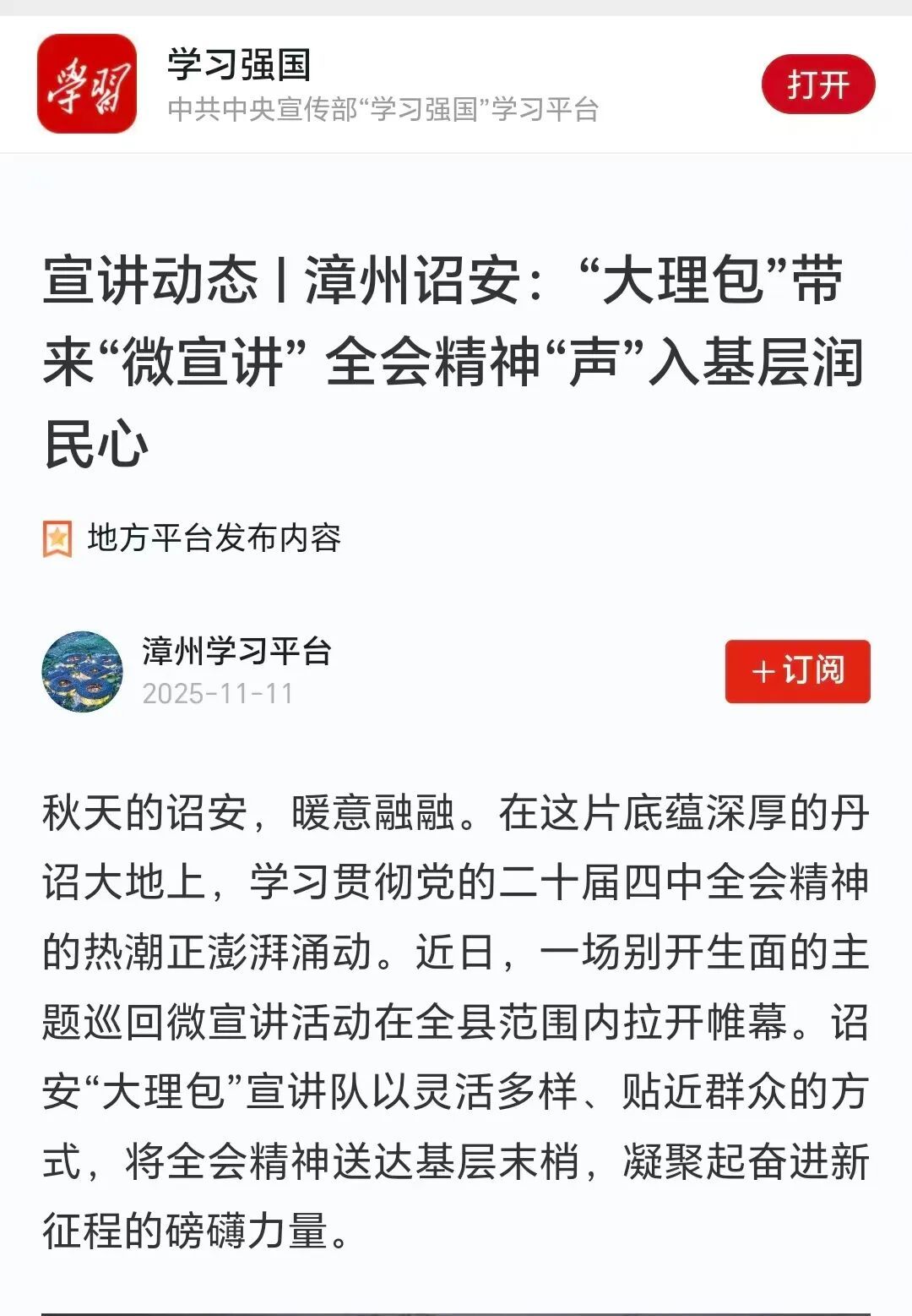 秋天的诏安,暖意融融。在这片底蕴深厚的丹诏大地上,学习贯彻党的二十届四中全会精神的热潮正澎湃涌动。近日,一场别开生面的主题巡回微宣讲活动在全县范围内拉开帷幕。诏安“大理包”宣讲队以灵活多样、贴近群众的方式,将全会精神送达基层末梢,凝聚起奋进新征程的磅礴力量。