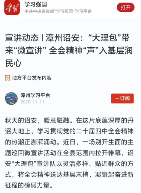 秋天的诏安,暖意融融。在这片底蕴深厚的丹诏大地上,学习贯彻党的二十届四中全会精神的热潮正澎湃涌动。近日,一场别开生面的主题巡回微宣讲活动在全县范围内拉开帷幕。诏安“大理包”宣讲队以灵活多样、贴近群众的方式,将全会精神送达基层末梢,凝聚起奋进新征程的磅礴力量。
