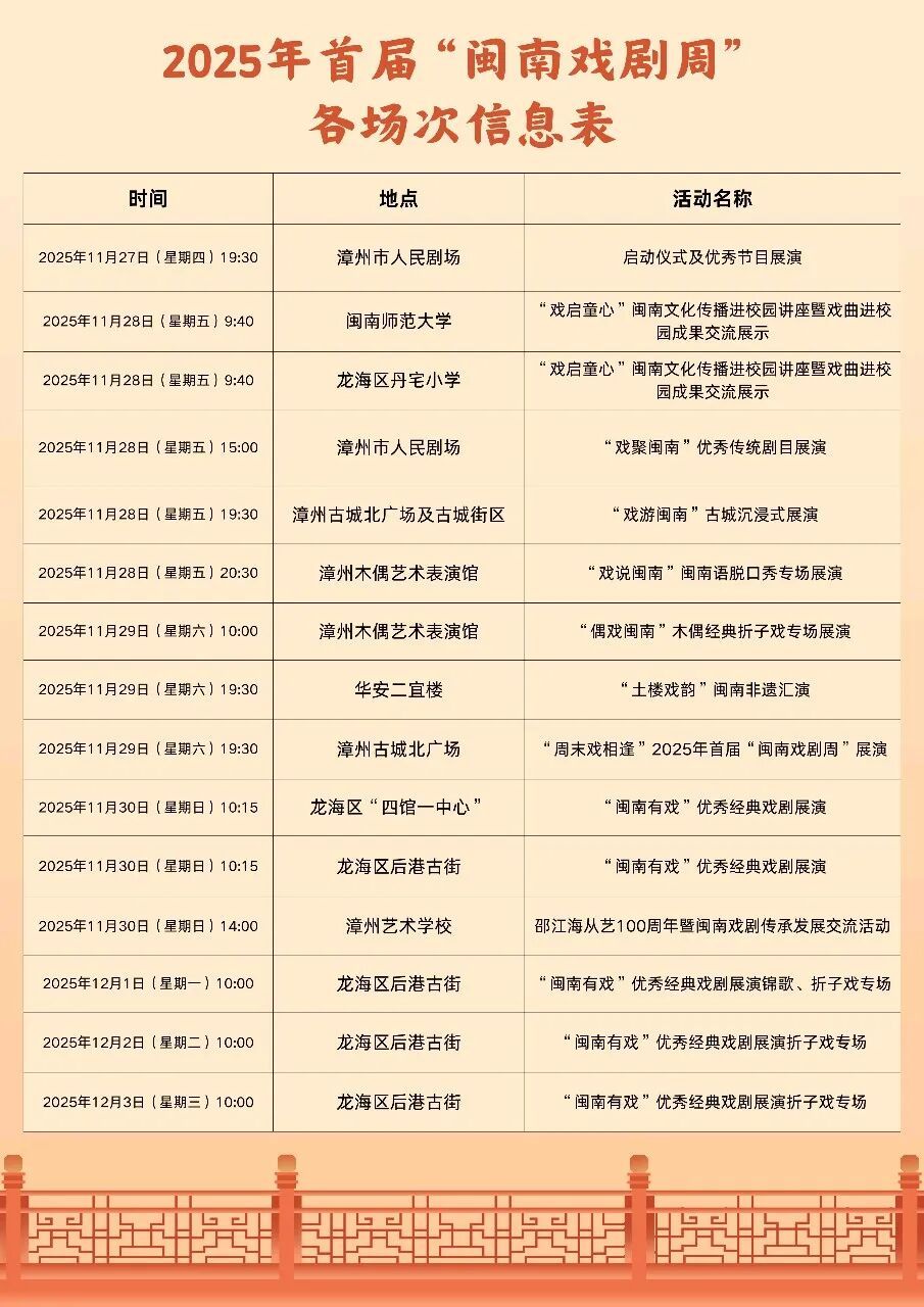 活动涵盖启动仪式、优秀经典展演、邵江海从艺100周年暨闽南戏剧传承发展交流活动、戏曲进校园、古城沉浸式展演、闽南语脱口秀、木偶经典折子戏专场展演、土楼非遗汇演、“周末戏相逢”公益演出等。