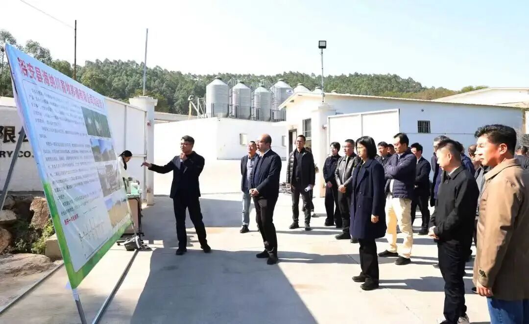 在诏安县海纳川畜牧养殖有限公司,现场考察猪舍配备全密闭自动化智能系统,采用 “尿泡粪” 污水处理模式,就近浇灌消纳地甘蔗等经济作物,实现粪污资源化利用。