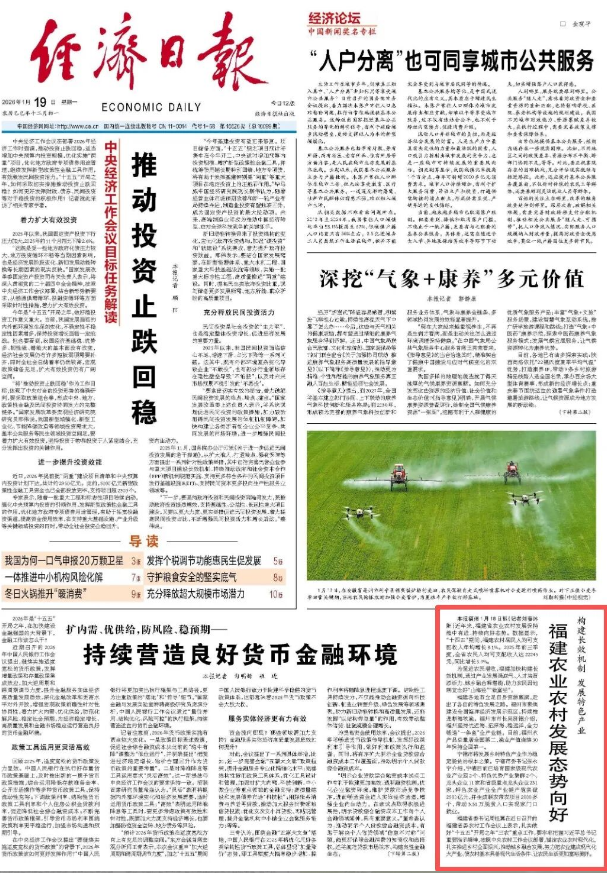 1月19日,《经济日报》头版刊发《福建农业农村发展态势向好》。详情如下——