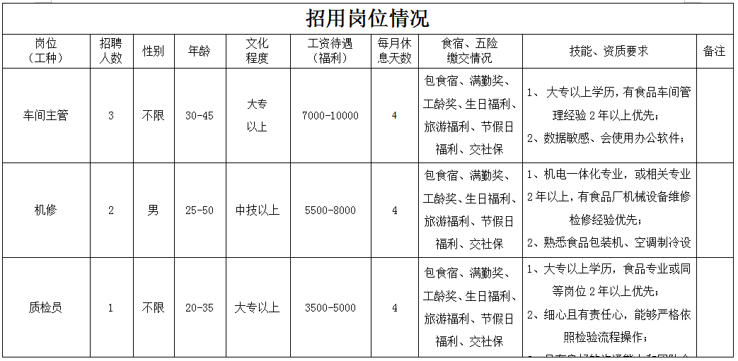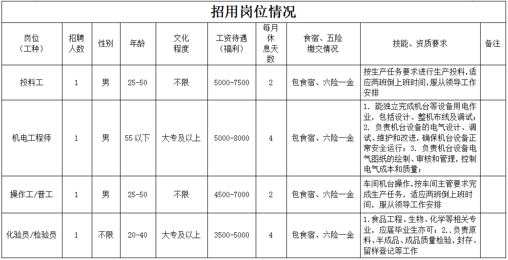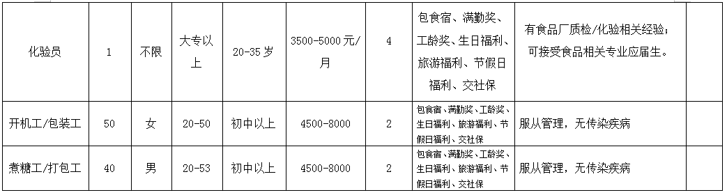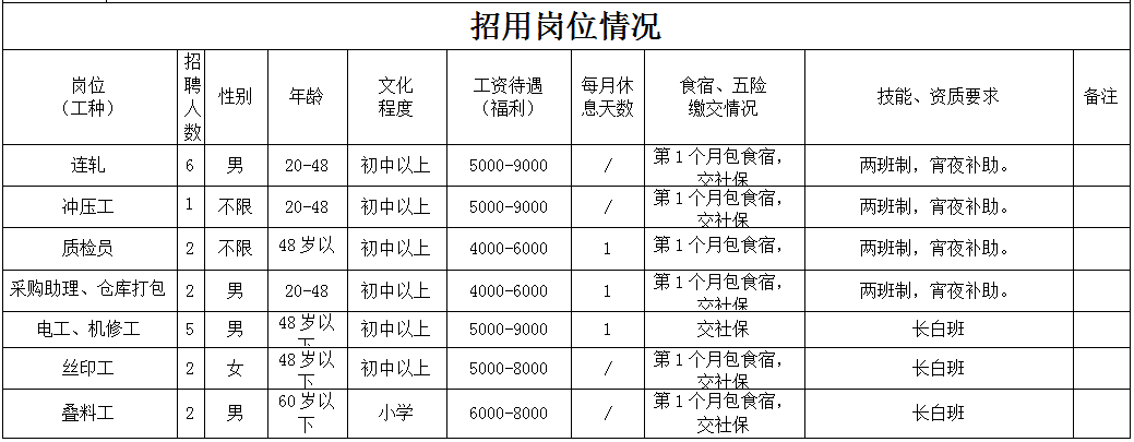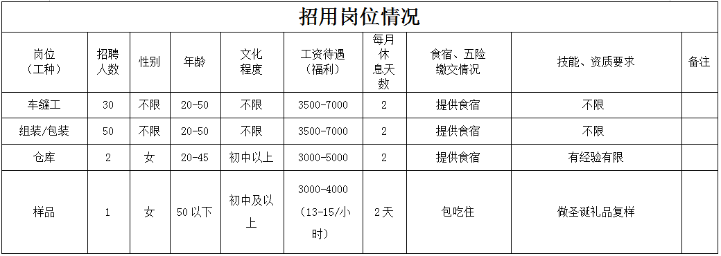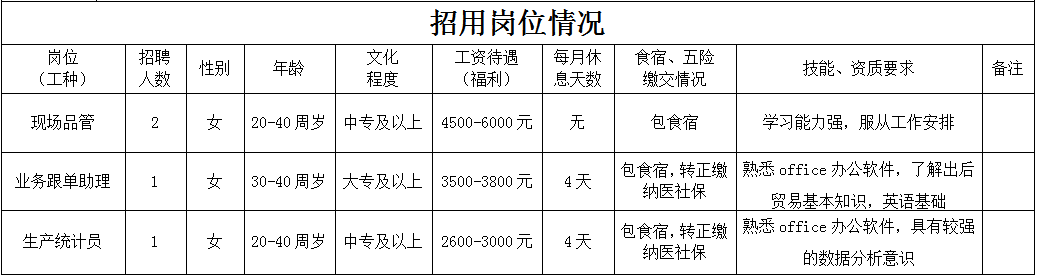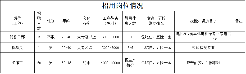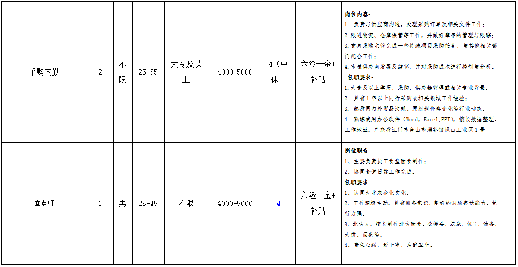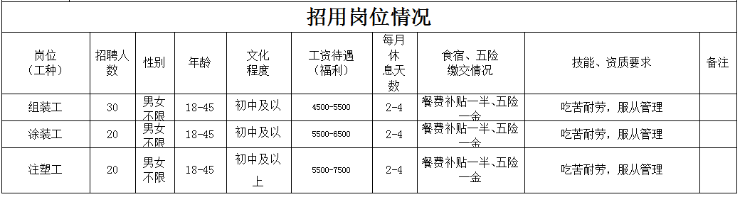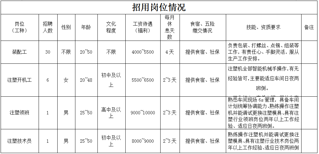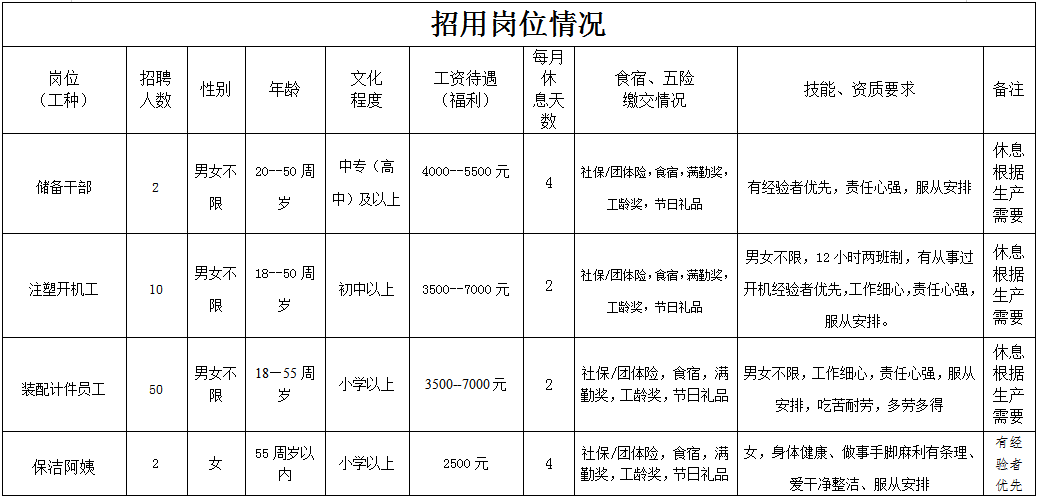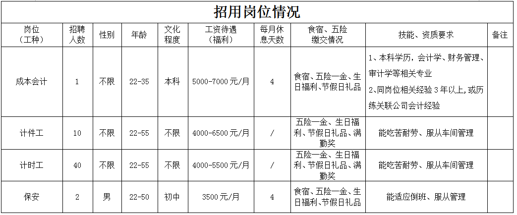 公司本着“以人为本、以诚取信”的企业精神,并以诚信、共赢、开创经营理念,致力为全体员工创造良好、卫生、宽松的生产环境。员工宿舍宽敞明亮,设施齐全(配有双卫、热水器、空调、双风扇、阳台、宽带等),食堂干净整洁。公司提供优厚的待遇:满勤奖、工龄奖、年终奖等,员工月工资3000-8000元。技术管理等岗位面议。