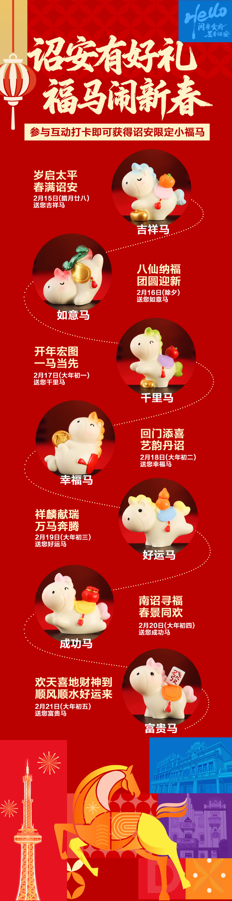 从腊月二十八至正月初五,我们以“福马”为伴,每日一“马”,送上满满的祝福:吉祥马、如意马、千里马、幸福马、好运马、成功马、富贵马……