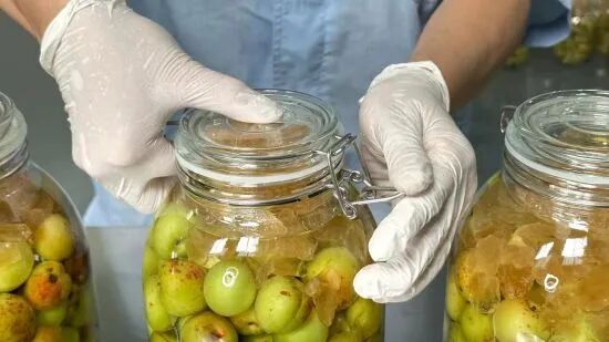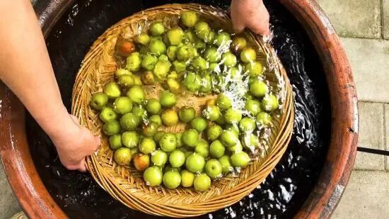 好酒的第一步是食材精选。诏安地处闽粤交界,气候温润,土壤中富含硒元素。这里生长的青梅果大、肉厚、核小、酸味纯正,且无农药残留,2020年被认定为国家级地理标志农产品。许逸霖说:“每年四五月间,我们采摘当地九分熟的青梅。颗颗饱满,梅香浓郁,这是任何后期工艺都无法弥补的先天优势。”采摘下来的青梅不能久存,要用粗盐轻柔搓洗,既杀菌,又磨去果皮绒毛,便于后续浸泡。搓洗的力度需恰到好处,重则酒体浑浊,轻则香气不足。洗净的梅子需阴干,待到果皮微微泛黄,散发出诱人的自然果香,方可进入下一道工序。