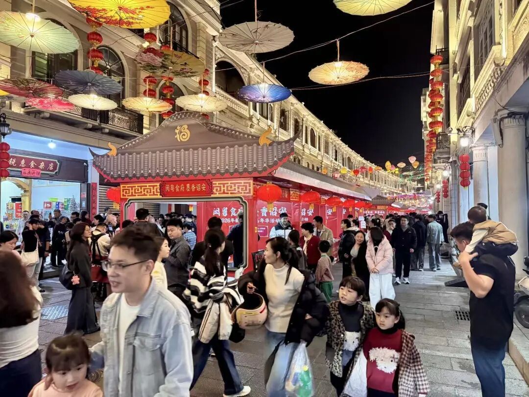 活动现场好戏连台、惊喜不断。灯影传福舞蹈快闪青春灵动,机甲舞阵科技感拉满,机器人矩阵精准起舞,传统与潮流碰撞出新潮年味。财神巡游沿中山路送福送喜,人偶互动、红包派发,市民游客欢声笑语不断;福娃闹春、传统绝活快闪、飘雪秀轮番登场,杂技、杂耍、近景戏法紧凑热闹,南国暖冬里的浪漫“雪花”成为网红打卡点。