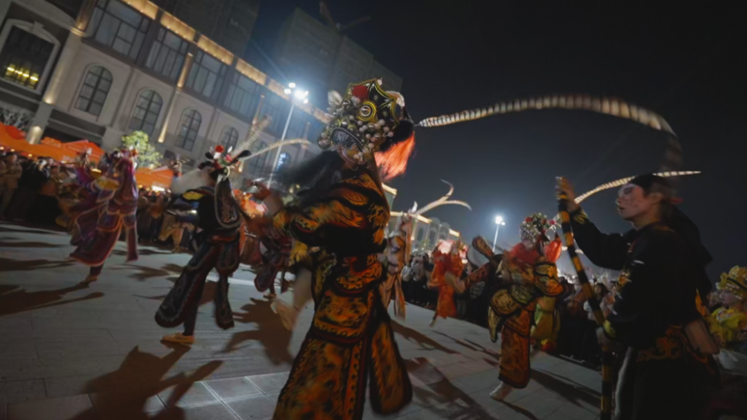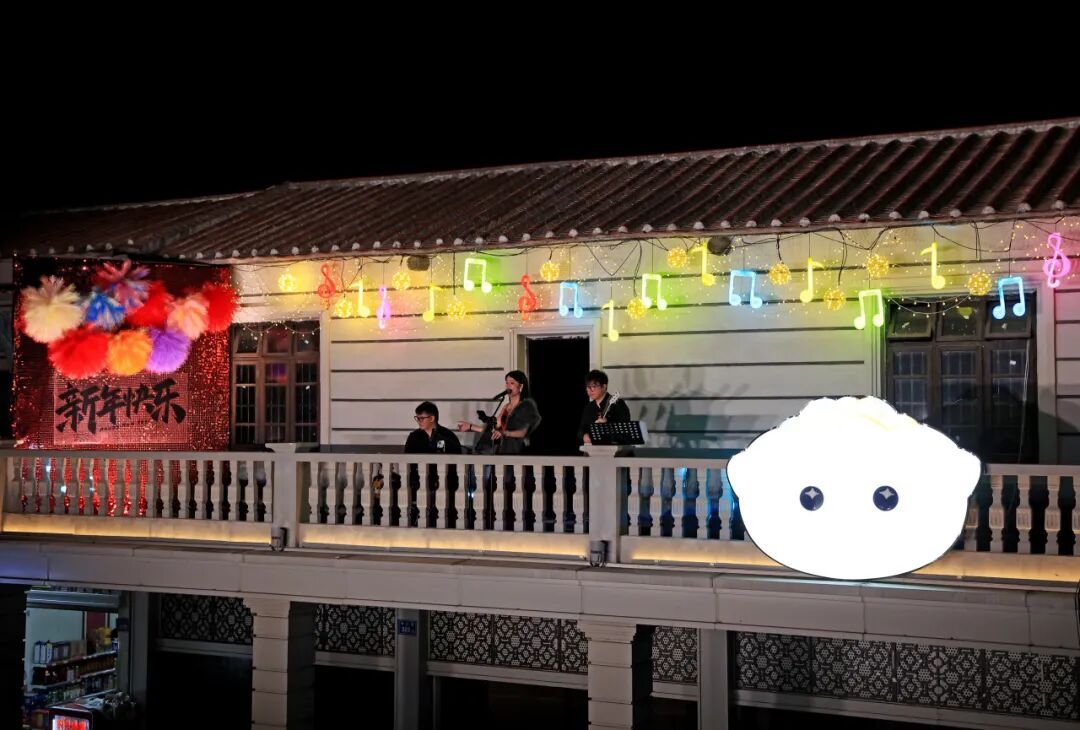 当晚,中山文化广场灯火璀璨、人气高涨。厝边音乐会率先奏响新春序曲,本地音乐人登台献艺,方言民谣、轻爵士、城市吟唱轮番上演,用烟火旋律温暖古城夜空。英歌舞表演气势磅礴,演员脸谱鲜明、槌法刚劲,伴着铿锵锣鼓踏步呐喊,尽显百年非遗的豪迈雄风,点燃全场热情。光影魔方秀与骑楼幻境光影秀以科技为笔、光影为墨,在古建筑间勾勒梦幻画卷,带来沉浸式视觉享受。