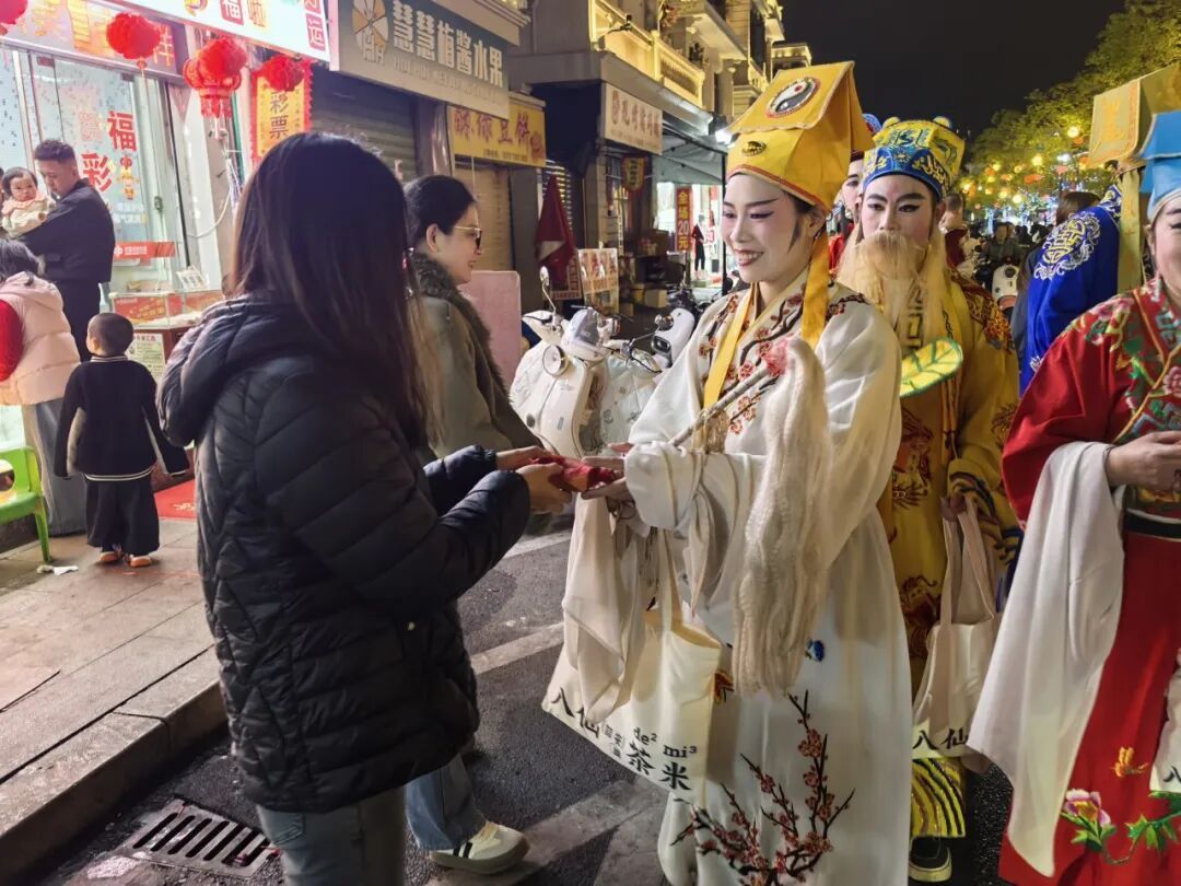 在“八仙茶韵”互动区域,古色古香的展示棚里,八仙茶的历史渊源、制作工艺和文化内涵得到了生动呈现,游客们在品茶、赏茶的同时,沉浸式体验了诏安本土的茶文化。而在当晚的“八仙赐福”巡游活动中,特色“八仙”手持道具,沿着街巷缓缓行进,将满满的新春祝福送到市民身边,场面喜庆而热闹。