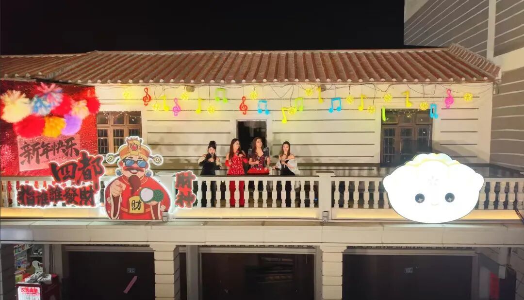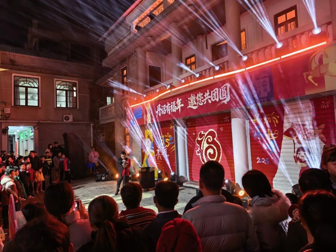 傍晚两场“工美韵动 快闪华彩”舞蹈快闪在灯笼墙前精彩上演,融合诏安本土文化元素的舞蹈活力四射,打破传统表演边界,为新春佳节增添灵动气息;“初二看杂技 全年都吉利”随后,在车水街对面的二层小楼街头表演同步亮相,专业魔术师、滑稽小丑携手灯光秀,带来一场充满惊喜与欢笑的趣味展演,让现场群众在欢声笑语中收获新春好运;转眼来到303号二楼阳台的天台音乐会则尽显浪漫格调,以古城夜色为幕、璀璨星空为伴,悠扬旋律随风飘散,为市民游客打造了一处静谧惬意的新春休憩港湾。