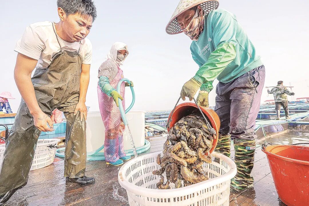 霞浦沙江镇海域,海参养殖户装载捕捞上岸的海参。霞浦是“中国南方海参之乡”,已形成了集育苗、养殖、加工、销售于一体的海参全产业链。资料图片