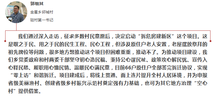 金星乡地处诏安县沿海地带,下辖邱城村等典型滨海渔村。随着城镇化进程加快,农村“空心化”问题日益凸显。以邱城村南门祠堂片区为例,原有66户,85间房屋中,仅剩13户老人留守,4800平方米建筑大多空置闲置,部分已成危房,巷道狭窄,既是安全隐患,也是乡村振兴的“绊脚石”。金星乡深入贯彻落实中央一号文件“建设宜居宜业和美乡村”目标要求,紧扣漳州市委市政府“一革命四行动”工作任务,以邱城村“拆旧房建新区”为试点,探索出一条“党委引领,村级主体,群众受益,发展可持续”的“空心村”治理新路径。