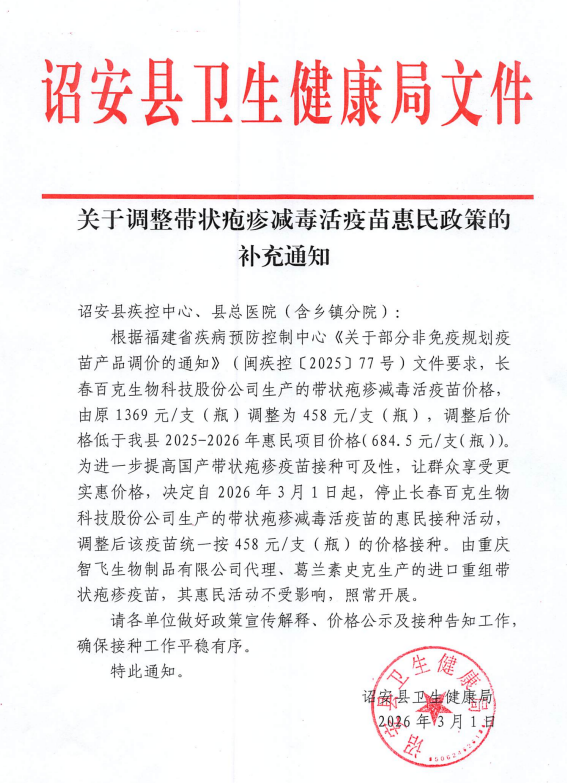 诏安县疾病预防控制中心收到福建省疾病预防控制中心发布的《关于部分非免疫规划疫苗产品调价的通知》(闽疾控 [2025]77号)文件要求,长春百克生物科技股份公司生产的带状疱疹减毒活疫苗价格,由原1369元/支(瓶)调整为458元/支(瓶),调整后价格低于我县 2025-2026年惠民项目价格(684.5元/支(瓶))。为进一步提高国产带状疱疹疫苗接种可及性,让群众享受更实惠价格,决定自2026年3月1日起,停止长春百克生物科技股份公司生产的带状疱疹减毒活疫苗的惠民接种活动,调整后该疫苗统一按458元/支(瓶)的价格接种。由重庆智飞生物制品有限公司代理、葛兰素史克生产的进口重组带状疱疹疫苗,其惠民活动不受影响,照常开展。