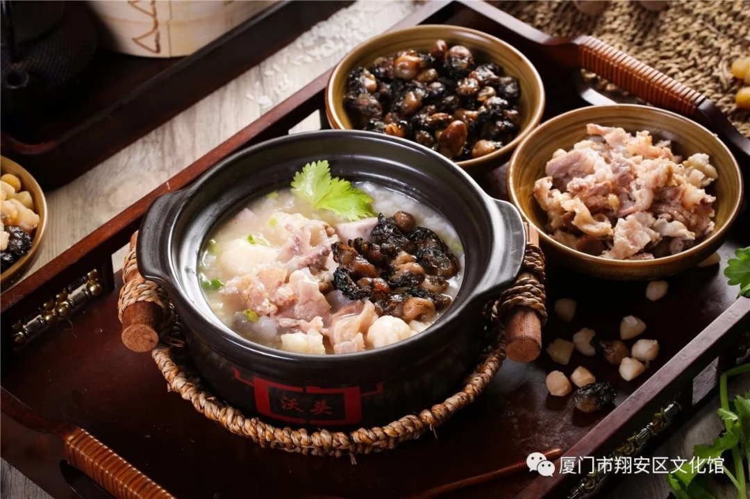 厦门的“澳头蠔干粥”采用农家黑猪的筒骨和农家老母鸡汤料,搭配红萝卜、干贝粉、扇贝粉、百合粉、枸杞粉、核桃粉、海鳗干粉、虾仁粉以及蚝干提炼的蚝油等几十味秘制食材用陶制砂锅熬制,再加入槟榔芋、新鲜花菜、青蒜末等,味道鲜美。