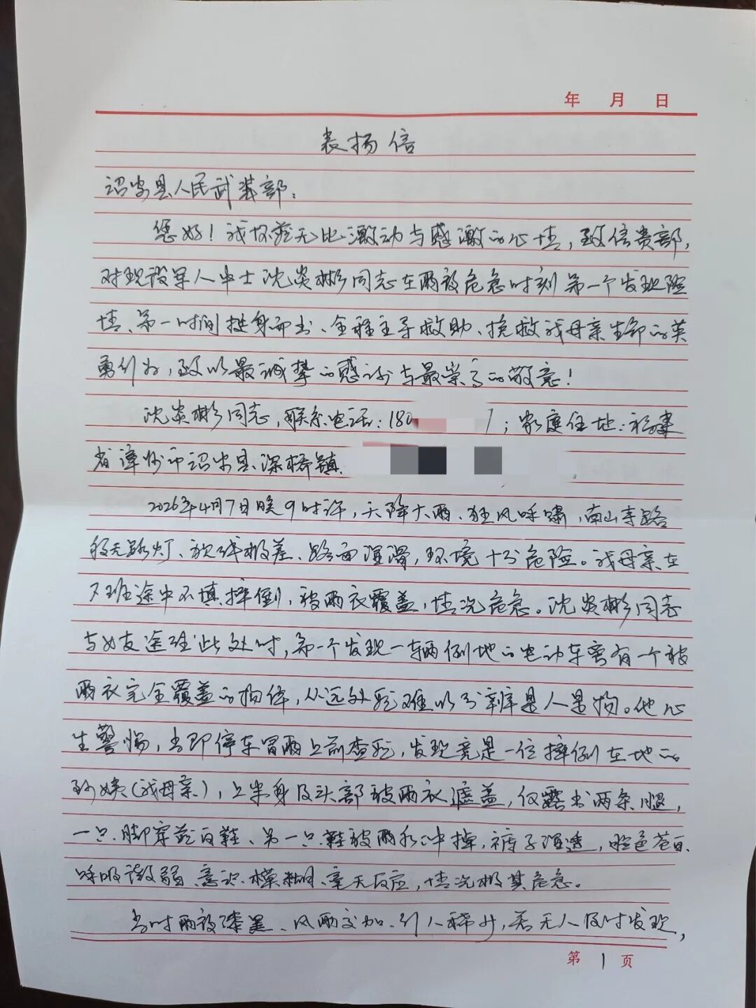 “阿姨,您别怕,我是军人,我来帮您!”沈炎彬一边大声安抚,一边急促地对女友喊道:“快快快,先打120!”风雨中,老人浑身发抖,意识时断时续。沈炎彬一直蹲在她身边,弓着身子为她挡住斜泼而来的雨水,耐心地一遍遍回答她的问题。他冒雨找回被水冲走的鞋子、散落的包包和手机。